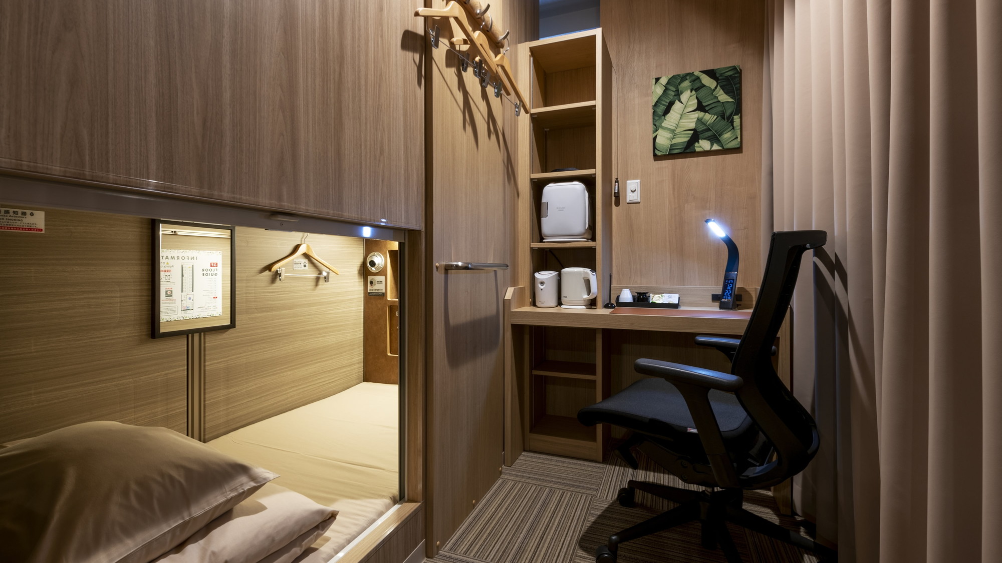 カプセルルームは広さが今までの1.2倍となっていて、カーテンで仕切られた半個室付きワークスペースカプセルは出張にもぴったり!