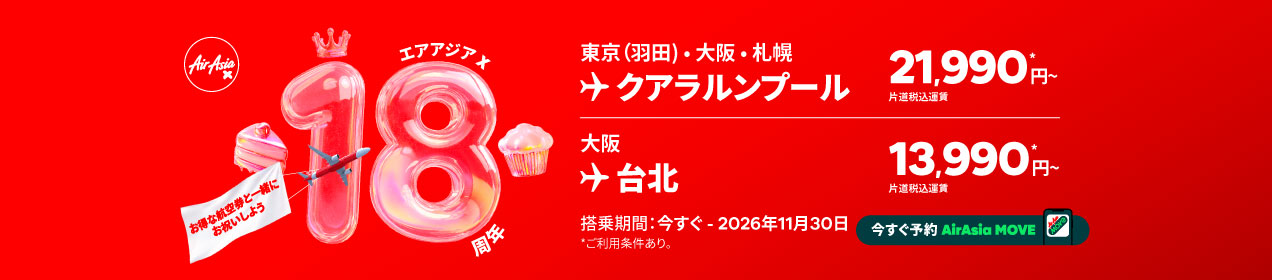 エアアジア 就航18周年記念セール(10/27~11/2)