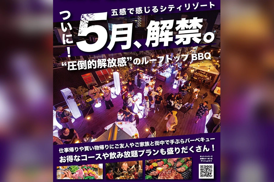 北九州・魚町ヒカリテラスの屋上で楽しむ「Rooftop Terrace Barbubba BBQ」は、北九州初となる圧倒的な解放感のルーフトップテラスBBQ!ソファ席やスタンディングスペースで、街中とは思えない非日常感たっぷりの開放的BBQ空間を満喫。