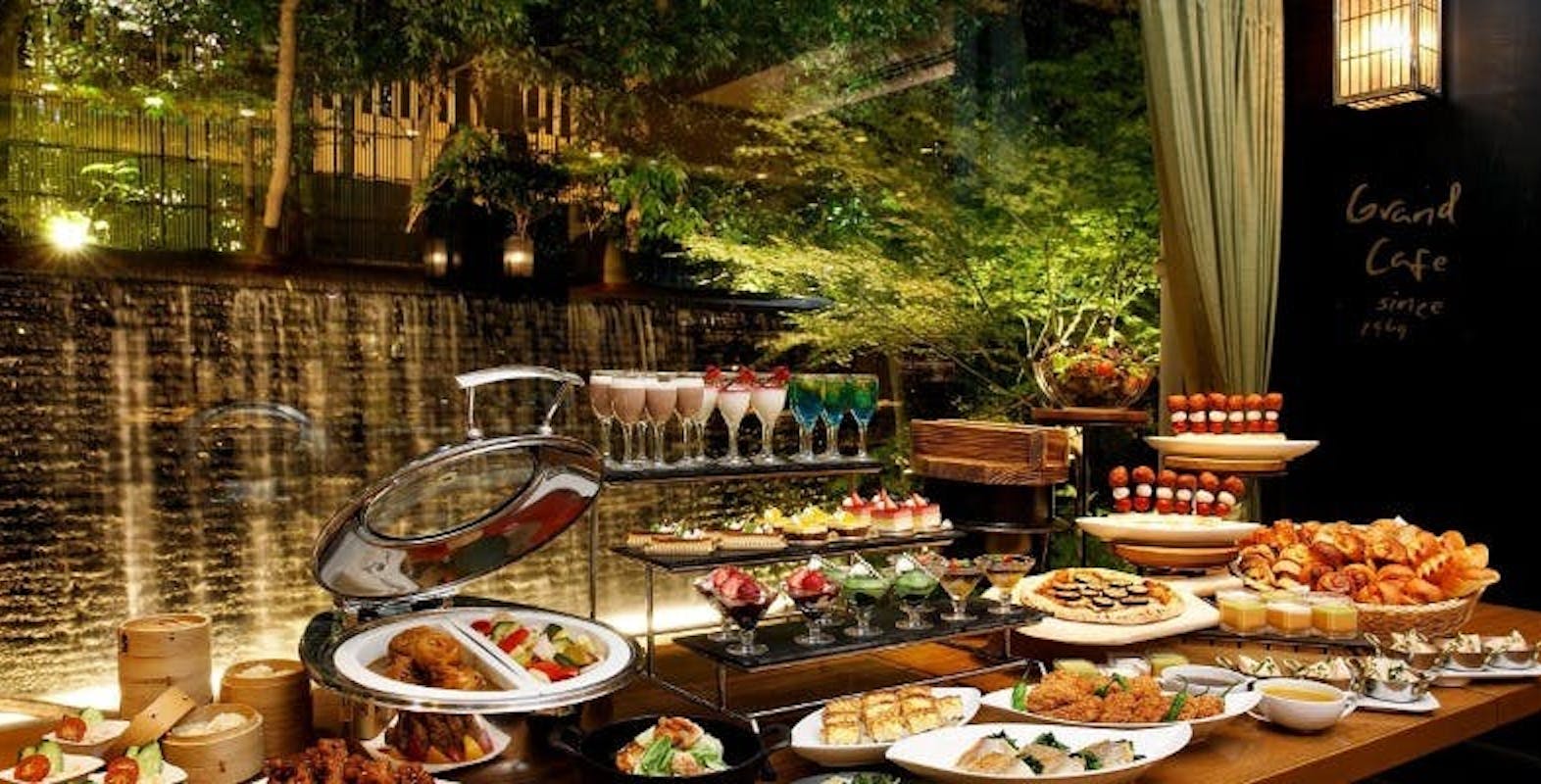 世界と日本をテーマにした多彩なビュッフェと、炭火焼の牛ロース&豚ロースが楽しめます