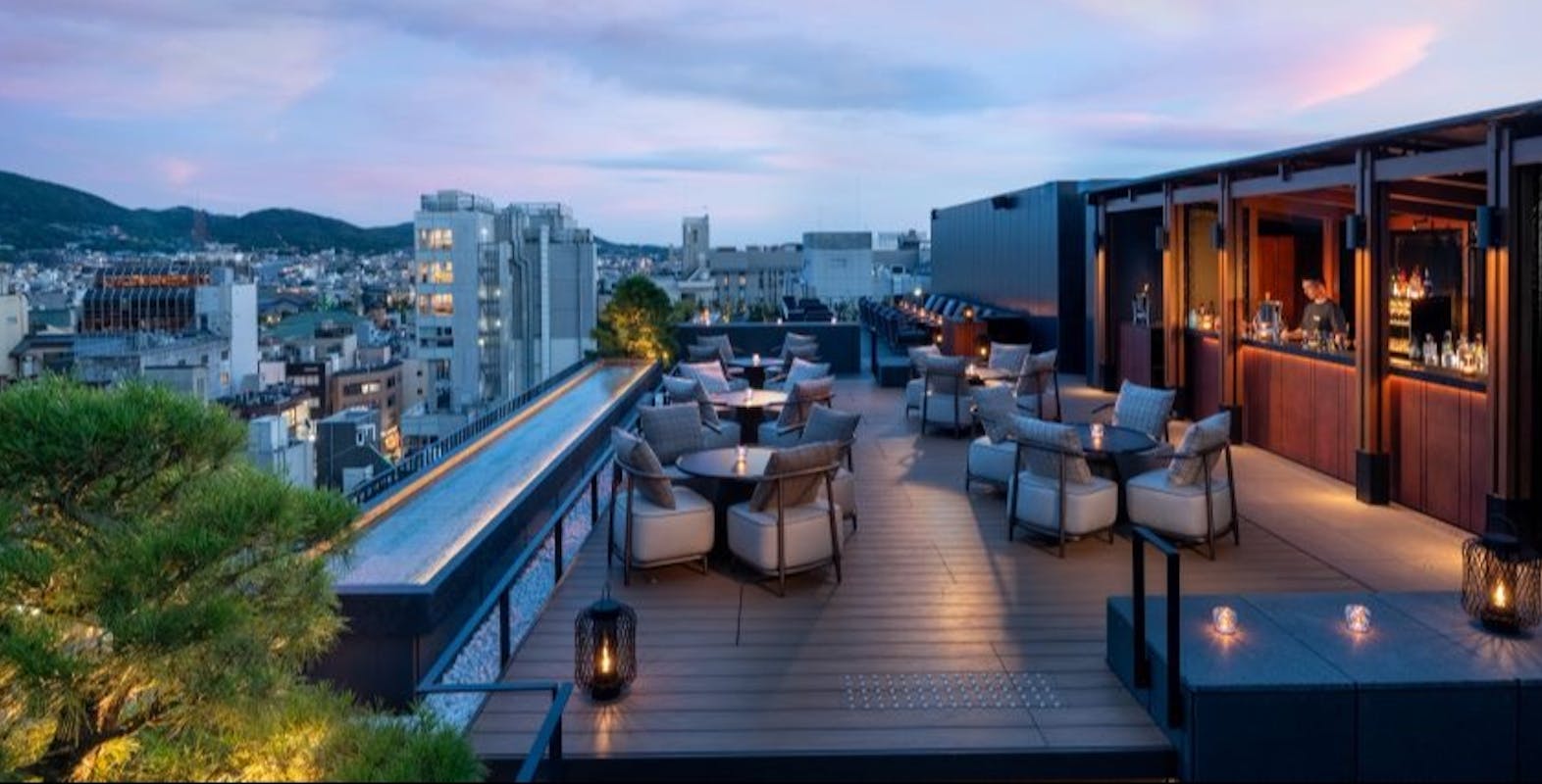 ノーガホテル清水京都最上階のルーフトップバーで、清水寺や比叡山を一望。