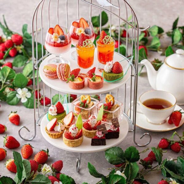 苺と季節フルーツのアフタヌーンティー。華やかなティースタンドには、甘く香るスイーツ9品と旬のセイボリーが並びます。カフェ&ソフトドリンクは3時間飲み放題で、ゆったりと贅沢なひとときをお楽しみください。