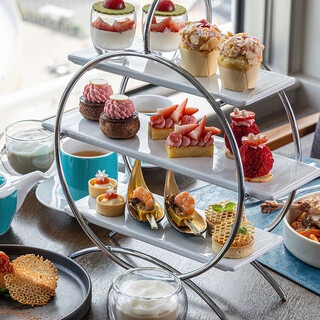 選べる肉または魚のメインに、スイーツ5種・セイボリー2種がのった3段ケーキスタンド、さらにスイーツワゴンから6種をお好きなだけ楽しめる贅沢プランが登場。スコーンやスープもセットになり、コーヒー、紅茶付きなのも嬉しいポイントです。ホテル最上階で甘いひとときを心ゆくまで堪能してください。