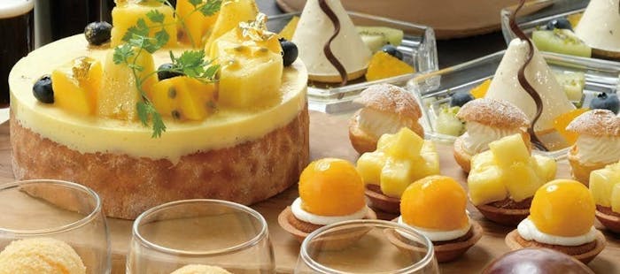 夏の甘い誘惑。オレンジ・マンゴー・バナナ・ピーチの夏のスイーツビュッフェ。パティシエが手掛ける吉野葛の葛切りもおすすめです。