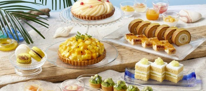 スーパーメロンショートケーキ/キャラメルバナナロールケーキ/黄桃のトランシュパイ/白桃のタルト(7月)/パイナップルとキウイのタルト(8月)/マンゴーとカスタードのショーソンパイ/マンゴーとチャイのガトー/白桃チーズロール/レモンティラミス/コーヒーとココナッツのムース/キウイの水まんじゅう/ベリームース/マンゴーとライチのタルトレット/トロピカルシュークリーム/シトロンシュニッテン/オレンジムースタルト/キャラメルオレのアントルメ
