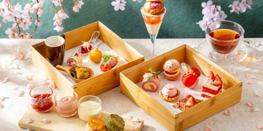 桜ストロベリー杏仁豆腐シュークリームのパフェや、桜とストロベリーのレアチーズタルトなど、旬の苺と桜が織りなす華やかなスイーツをご用意。春の訪れを感じる優雅なティータイムをお楽しみください。
