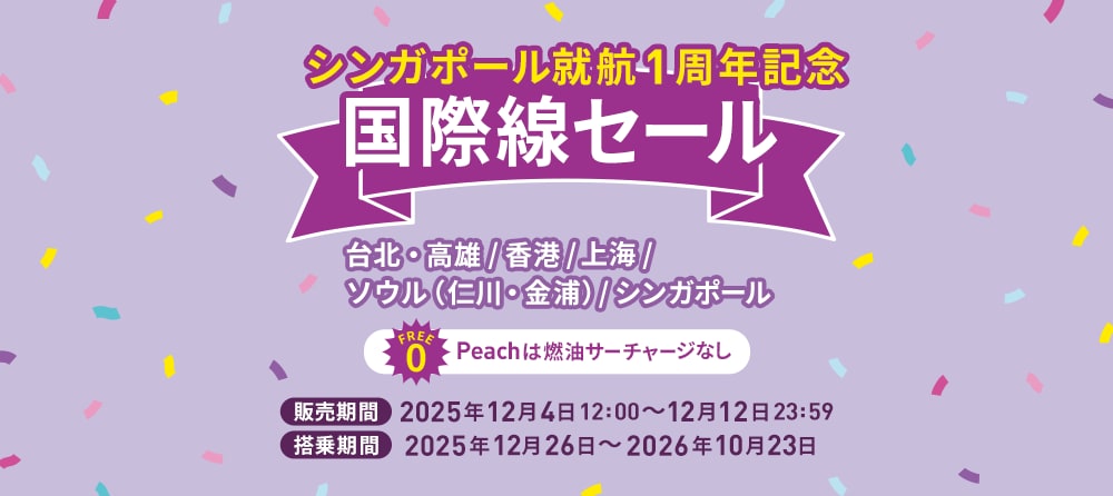 Peach シンガポール就航1周年記念 国際線セール(12/4~12/12)