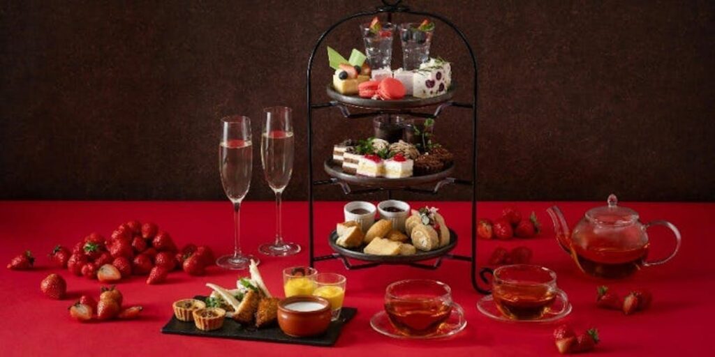 ベリーとチョコレートを主役に、マカロンやモンブラン、ロールケーキなど華やかなスイーツが勢揃い。名古屋コーチン卵と鰻のキッシュや味噌カツなど、食べ応えあるセイボリーも楽しめる満足感たっぷりの内容です。