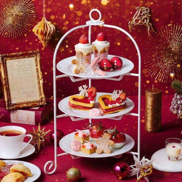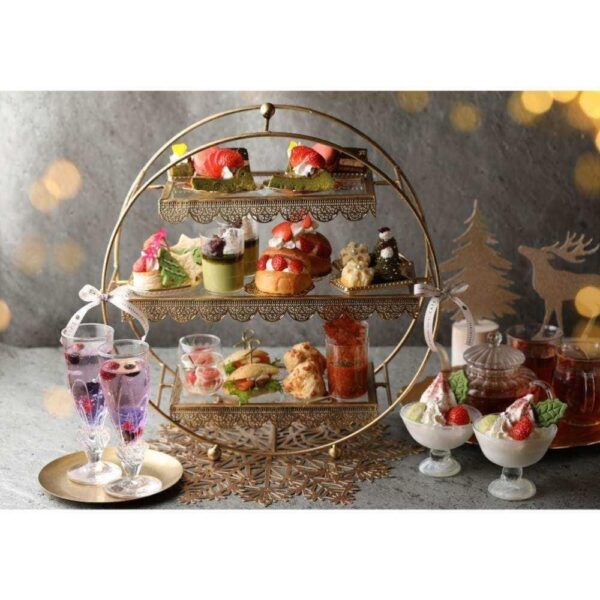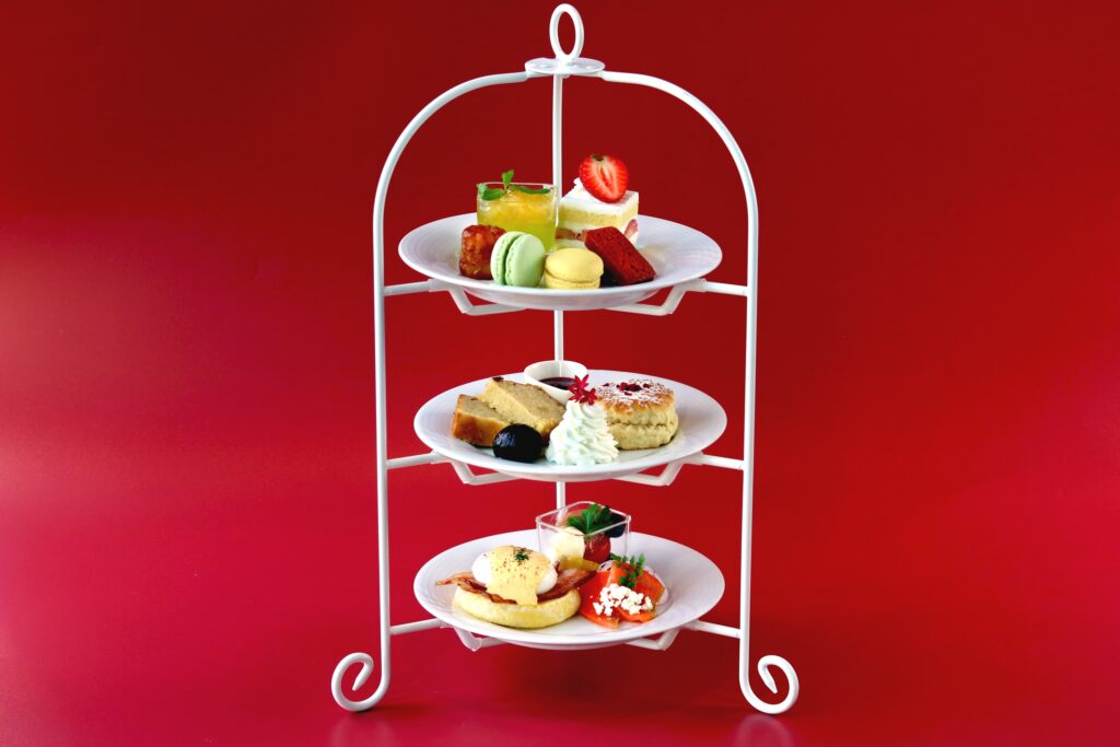 ティースタンドにはアフタヌーンティースタンドセットはケーキ+焼菓子+パン+ドリンクのセットで、